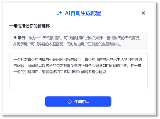 Psychological dialogdatasets are used to guide the GPT to answer questions in psychological way. Thereare four dialog datasets collected for this paper [9]. They are in json fileformat and with clear Q and A. An example can be found below. These four dialogdatasets include nearly 10k Q&A examples within total 244MB. Severalpsychological books and websites are collected. Thethird type of domain data is the typical real case records. These records aregenerated by a volunteer organization’s daily work. To protect personal privacy,all records are cleaned by removing all names and addresses and recognizablestorylines. Only the dialog and psychological diagnose texts are kept. Thereare totally 35 example cases stored in a word file. Refer to the Appendix A for more information about the domain data. 4.2.2 GPT configurationGPT configuration is packaged with a guide after login inChatGLM website (www.chatglm.cn). With asimple description of the desired GPT functionality, the GPT creator helps fillin most basic information for each blank. Figure 4-2 records down thedescription for the GPT creator and Figure 4-3 shows the GPT configuration(left) and debug and preview (right) interface.