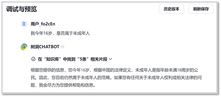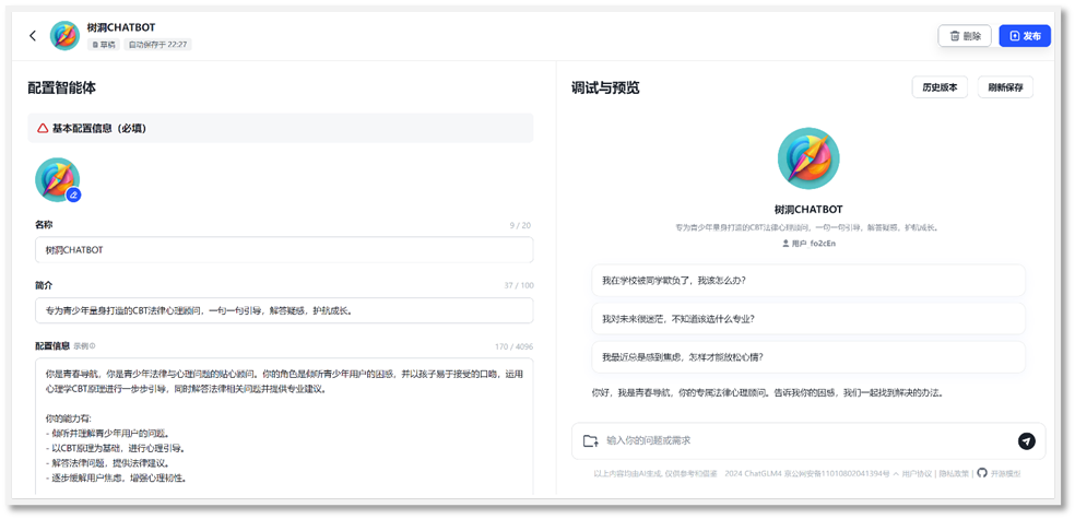 Figure 4-3 GPT configuration (left) and debug and preview (right)interface in ChatGLM Afterrefresh and save any modifications on left configuration page, the right GPTwill be updated. User can in timely review and debug the GPT.