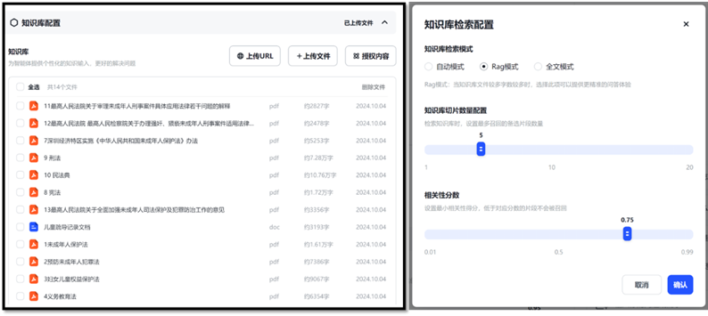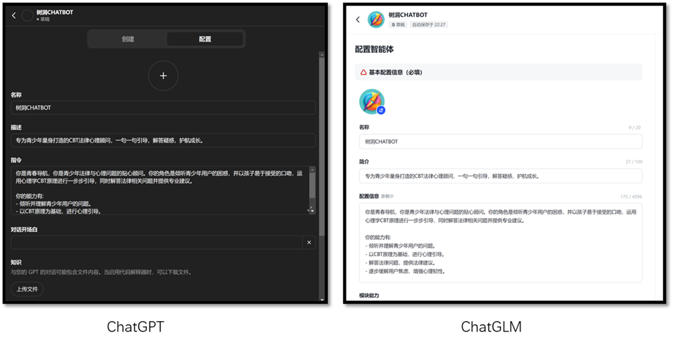Figure 4-1 GPT creator in ChatGPT and ChatGLM After input simple guidance in the GPT creator, a debug and preview pageis displayed on the right side. The following steps are to input the domainknowledge data files. 4.2.1 Data preparationBeingfeed on a legal and psychological guidance system for adolescents, the domainknowledge includes the laws and regulations related to the adolescents,psychological dialog datasets and real guidance case records. Thelaws such as “The Constitution”, “The Criminal Law”, “The Civil Code of thePeople's Republic of China” and “Law on the Protection of Minors” issued by thenation government; the regulations such as “Regulations on the Protection ofMinors in Guangdong Province”, Measures for the Implementation of the Law ofthe People's Republic of China on the Protection of Minors in Shenzhen SpecialEconomic Zone” ,issued by local governments. And explanations from the SupremePeople's Court and the Supreme People's Procuratorate. There is total 13 filesin PDF format with OCR enabled. Since these law and regulation files areorganized by article, texts in these files are easily to be split by article. Therefore,there are total 2453 articles. No special data clean is needed.