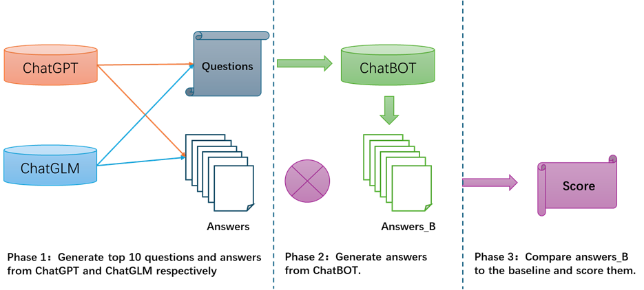 Figure 4-6 ChatBotevaluation flow Firstly, we use the ChatGPT and ChatGLM respectively, to generate top 10questions which are related to adolescents during their study and life. At thesame time, recode the corresponding answers as baseline . After that, the total20 questions is sent to ChatBot, and another 20 answers are generated by ChatBot,named as Answers_B. Finally, three volunteers are invited to judge whether theanswer_B has higher quality than corresponding baseline answers on the threeaspects: professional, effective, and acceptable in mood for the minors. Score0 stands for the answer_B is worse than the baseline answer. Score 1 means thetwo answers are comparable and Score 2 means the answer_B has better qualitythan the baseline answer. “Prof.” stands for the completion and professional. “Effe”stands for the feasibility and clear enough. “Acce” stands for the moodacceptable for the adolescents. The final score is list on the table 4-2 asbelow. Table 4-2 ChatBotevaluation score
