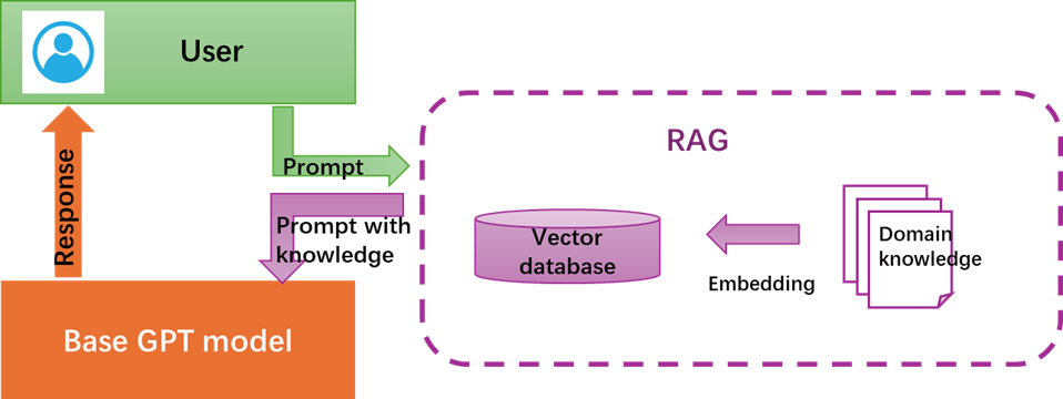 Figure 3-3 RAG based GPT workflow There are three key steps to build up a RAG Vector database which iscalled Embedding progress. Step 1 Text Segmentation: in general,domain knowledge is stored in a set of files. Limited by the token size of a transformermodel, texts in a file must be segmented. In general, texts could be split by naturalparagraphs or sentences. Step2 Text Embedding: Each slice of textcould be transformed to a vector. All vectors will be stored in a vectordatabase with an Index. These embedding operations can be implemented by theBERT model. The most popular vector database is ElasticSearch. Step3 Text Search: RAG will embed theuser input query statement into vector too, and then compare the vector withvectors stored in the vector database to find the similar one which presentsthe similar meanings in text. Figure 3-4 describes how to compare two sentencesin vector domain. Sentence A and Sentence B can be embedded into vector u andvector v. Then, the distance between vectors can be calculated cos-distance,which is described as follow equation. The larger of cos means the much closer ofthe two vectors.